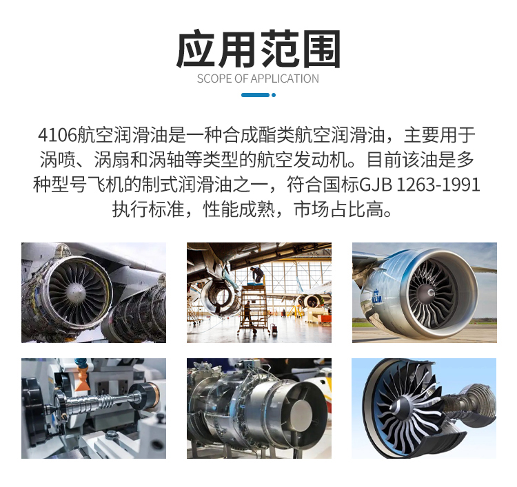 4106航空潤滑油是一種II類中粘度航空潤滑油,由長城潤滑油一坪化工廠研制生產。該油符合國軍標GJB1263-1991《航空渦輪發動機用合成潤滑油》執行標準,是軍用制式航空潤滑油。
