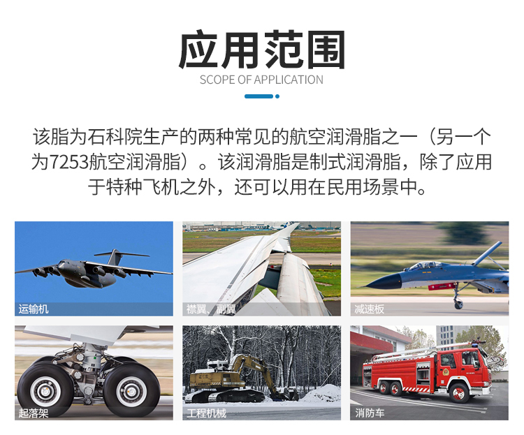 該脂為石科院生產(chǎn)的兩種常見(jiàn)的航空潤(rùn)滑脂之一(另一個(gè)為7253航空潤(rùn)滑脂)。該潤(rùn)滑脂是部隊(duì)制式潤(rùn)滑脂,除了應(yīng)用于飛機(jī)之外,還可以用在民用場(chǎng)景中。