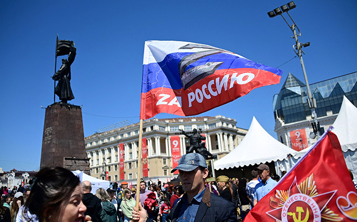 除莫斯科外,從太平洋的符拉迪沃斯托克到中歐的加里寧格勒,其他 27 個俄羅斯城市也舉行了規模較小的游行。總體而言,超過50,000名士兵參加了游行。上圖顯示為遠東城市符拉迪沃斯托克舉行的勝利日慶祝活動,一名男子手持帶有字母 Z 的俄羅斯國旗。
